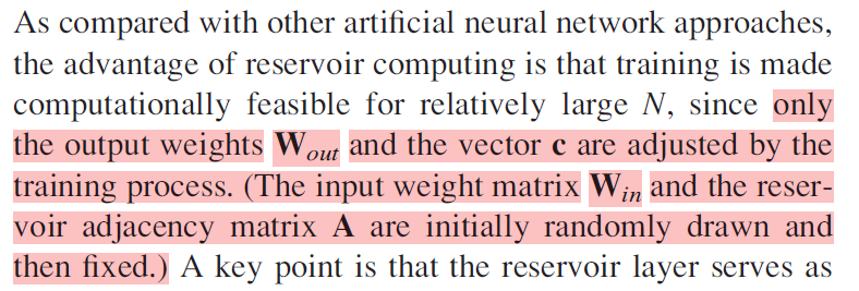 독특한 점은, RC에서 학습을 시키는 대상은 \( W_{out} \)과 \( \mathbf{c} \) 뿐이다. (그 덕분에 계산이 매우 빠르고 효율적임)