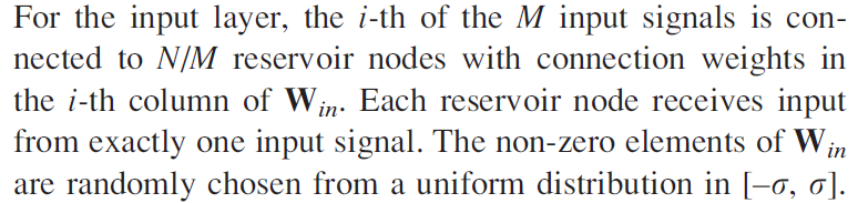- \( M \) 개의 입력값 각각이 reservoir layer에서 \( N/M \)개의 node에만 연결되도록 설정
